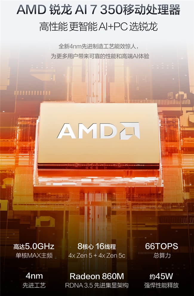 处理器内置AMD Radeon™ 860M集成显卡,图形处理能力同样出色,足以应对日常的创意设计需求。更为关键的是,该平台提供了高达66TOPS的AI总算力,能够为本地运行的各类AI文生文、文生图、智能语音助手等应用提供充沛算力支持,让智能办公从概念走向现实,显著提升内容创作与信息处理的效率。
