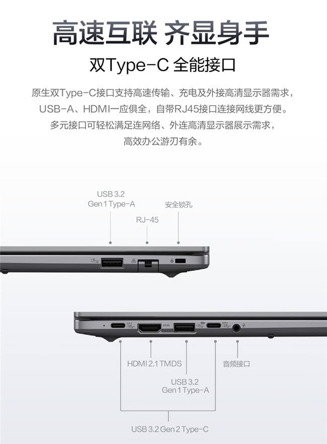 在连接扩展性上,这款笔记本也展现了其全能的一面。机身两侧配备了丰富接口,包括2个USB 3.2 Type-A、2个USB 3.2 Type-C、HDMI 2.1、音频接口以及实用的RJ-45网线接口,无需携带繁琐的转接器,即可轻松实现多屏协作、高速数据传输和有线网络连接,为用户搭建起高效的一站式办公指挥中心。支持Wi-Fi 7和蓝牙5.4技术,则确保了无线连接的高速与稳定。