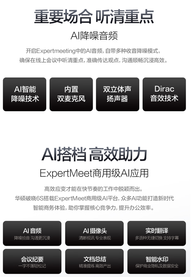 值得一提的是,华硕破晓6S锐龙版还内置了ExpertMeet AI会议助手,集AI降噪拾音、清晰视讯、会议记录、实时翻译、文档摘要等实用功能于一身,能够显著提升远程协作的沟通效率与会议质量,让跨地域团队协作如同面对面般顺畅自然。