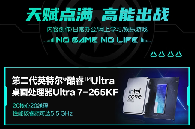 作为整机的“大脑”,华硕天选6X搭载的英特尔第二代酷睿Ultra7-265KF处理器,其采用3nm制成工艺,拥有20核20线程,最高睿频5.5Ghz,单核算力表现强劲,更在多核调度与高频运算中展现出强大实力。无论是像LOL、永劫无间大规模团战中的技能齐发,还是三角洲行动、无畏契约高速转点时的场景切换,整机性能都能确保画面流畅、指令响应即时,给玩家丝滑流畅的游戏体验。