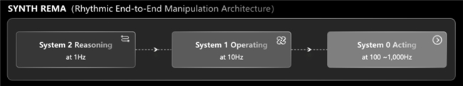 • 深思·执行(SYNAction):面向操作智能的专属模型架构,章鱼动力首创REMA分频多尺度端到端操作架构,在统一模型中通过三层闭环完成从认知到执行:System 2(低频)负责任务理解、认知推理与高层规划,System 1(中频)负责动作策略生成、衔接认知与执行,System 0(高频)负责底层控制与精细交互执行,助力机器人高效完成复杂操作、实现全流程执行闭环。